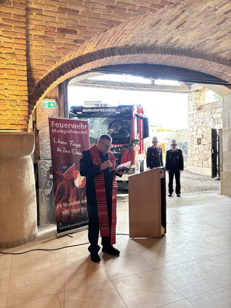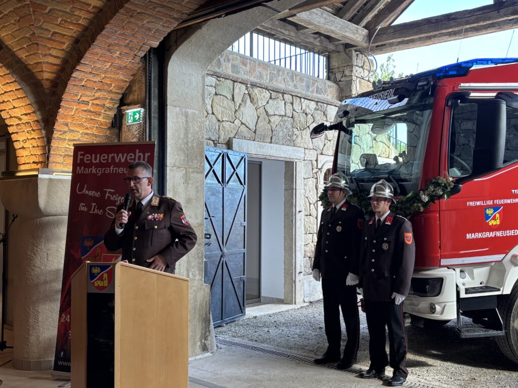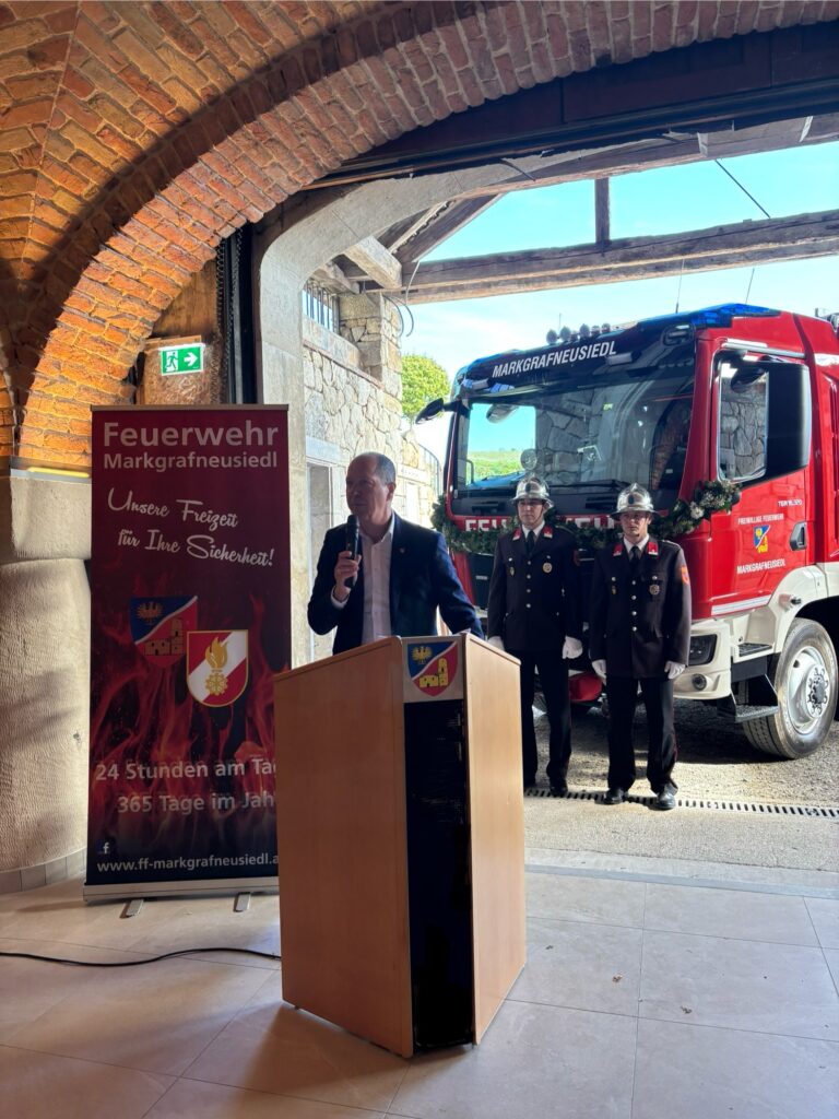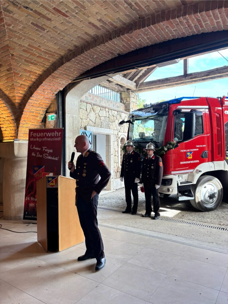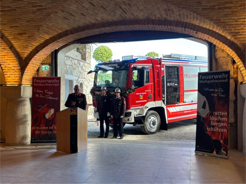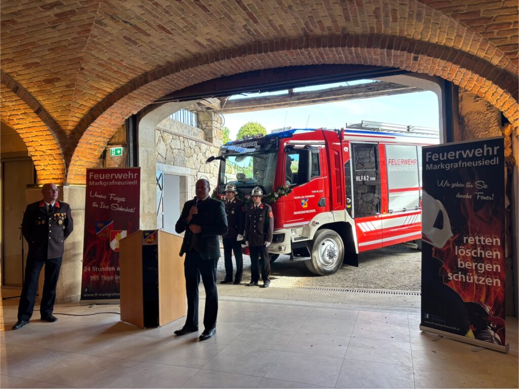 In seiner Ansprache ließ Kommandant Hofer das Projekt sowie den Ankauf des Hilfeleistungsfahrzeugs 2 Revue passieren und gab einen Überblick über die nicht unerheblichen Kosten. Ein besonderer Dank galt der Gemeinde, die einen großen Teil der Finanzierung übernahm und damit der Feuerwehr ein komplett neu ausgestattetes Fahrzeug zur Verfügung stellte. Neben der Förderung des Landes konnte auch die Feuerwehr Markgrafneusiedl selbst einen Teil der Kosten übernehmen – möglich gemacht durch die Unterstützung der Bürgerinnen und Bürger der Gemeinde sowie die Besucherinnen und Besucher unserer Feste.