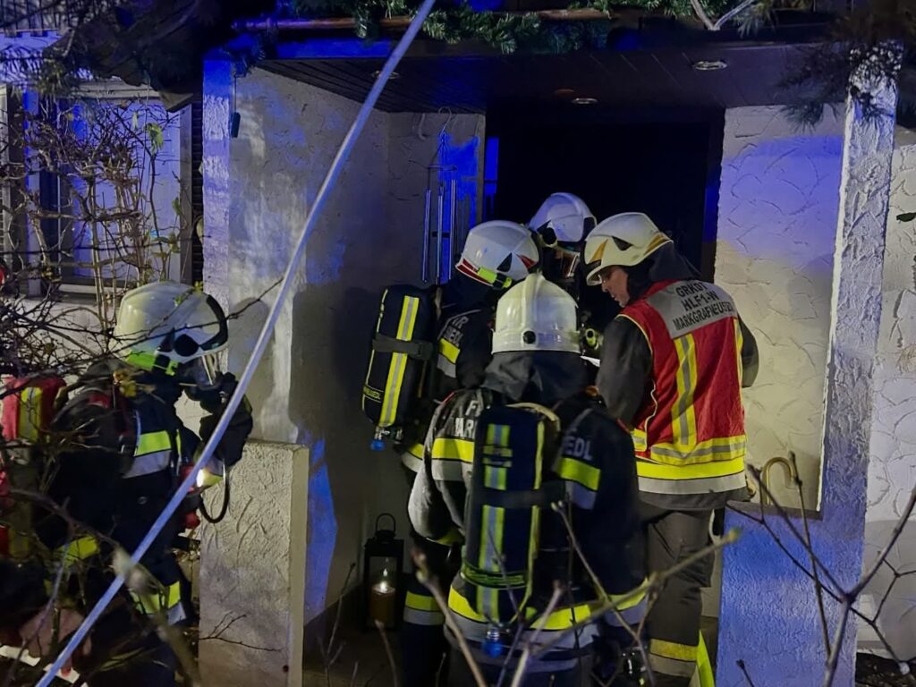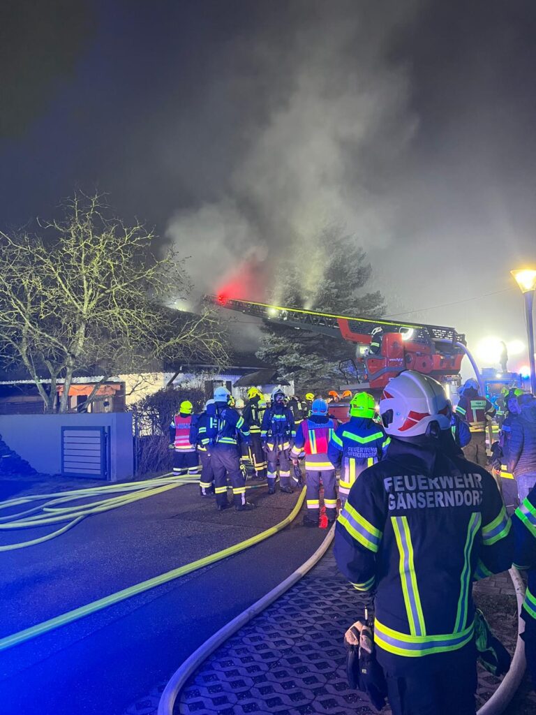 Beim Eintreffen schlugen bereits Flammen aus dem Obergeschoss. Unsere Mannschaft stellte zwei Atemschutztrupps, die Wasserversorgung für den Innen- und Außenangriff, den Einsatzabschnittsleiter Innenangriff sowie den Ablaufposten für die Atemschutztrupps.