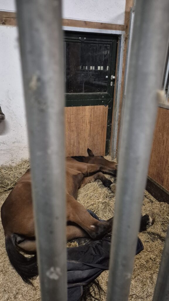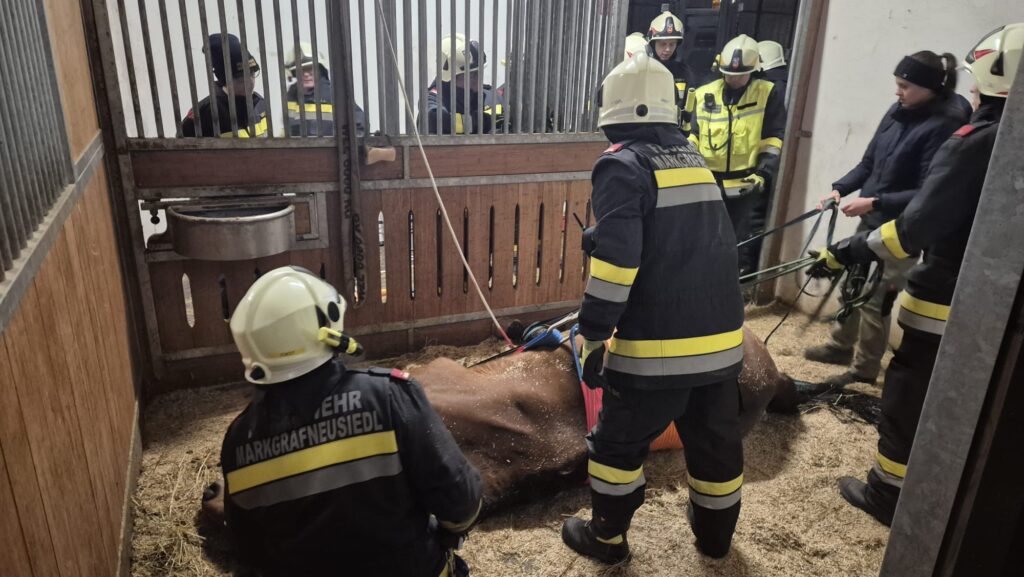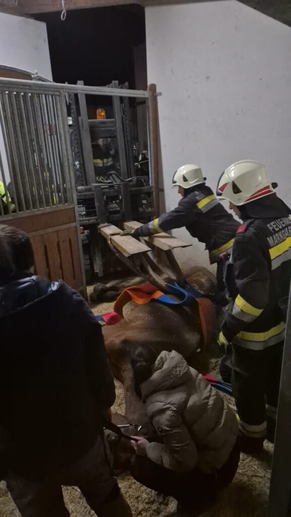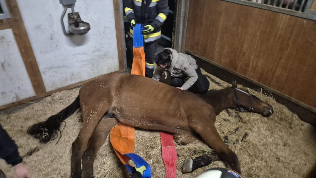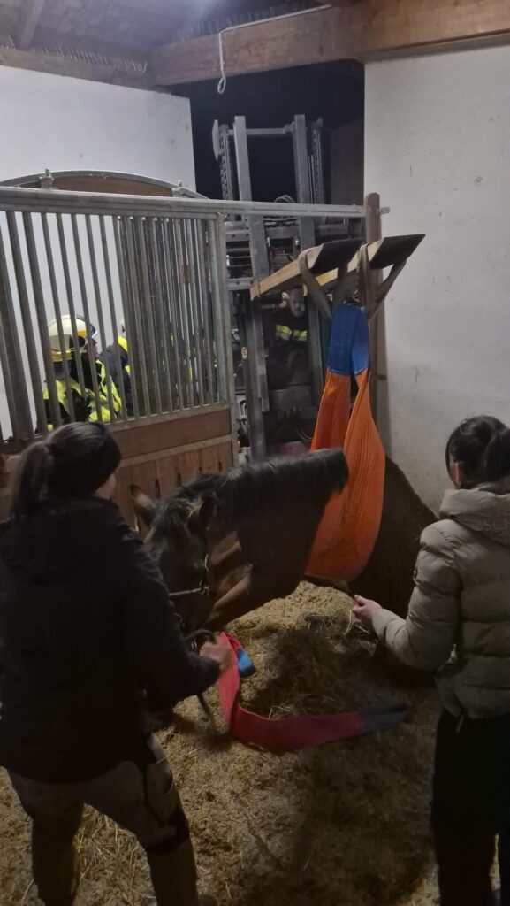 Am 27. Dezember um 18:45 wurden wir zu einem nicht alltäglichen Einsatz alarmiert. Ein Einweiser führte uns zur Einsatzstelle. Dort fanden wir ein in seiner Box, am Boden liegendes Pferd vor.