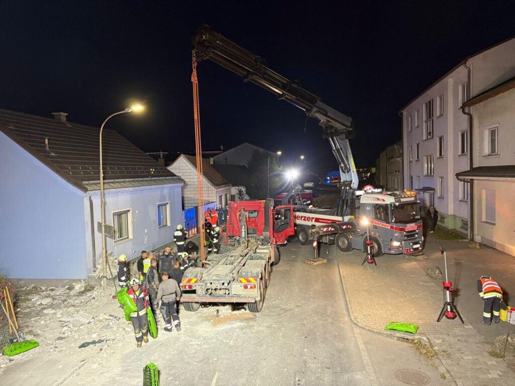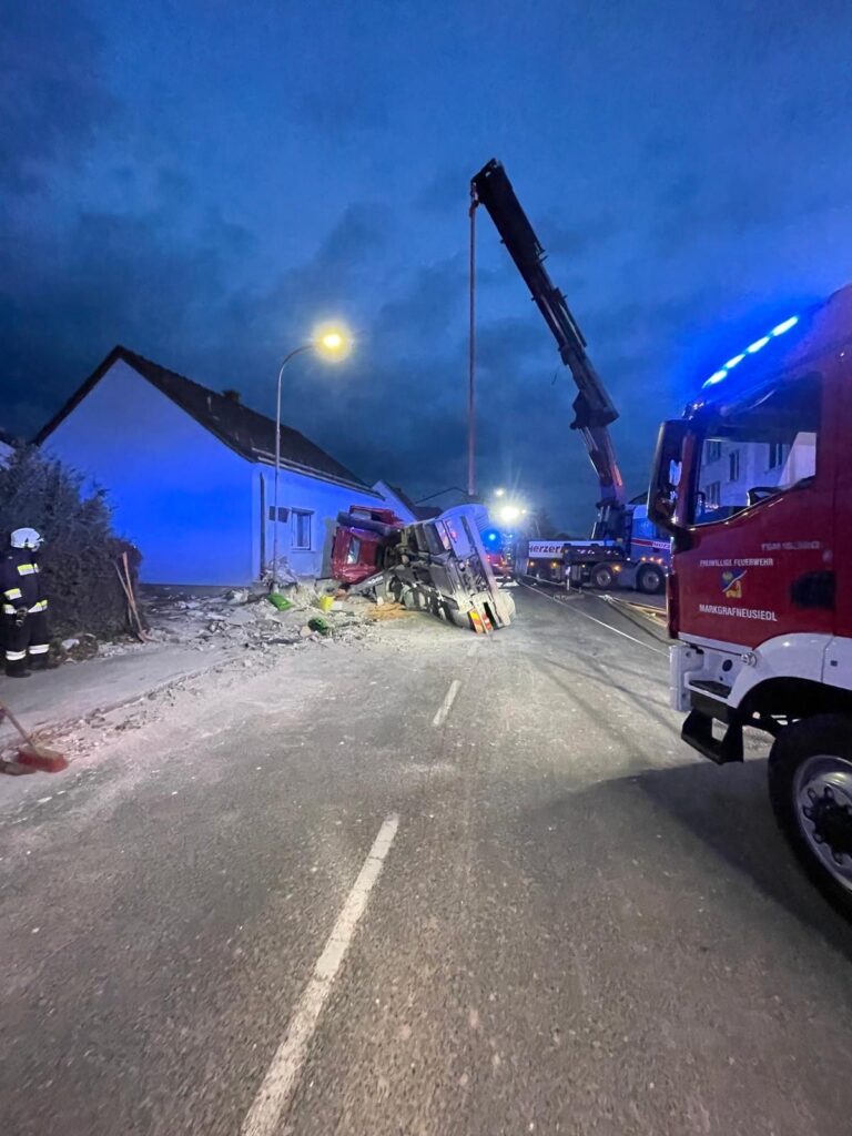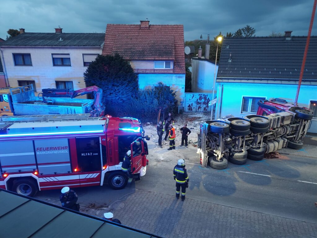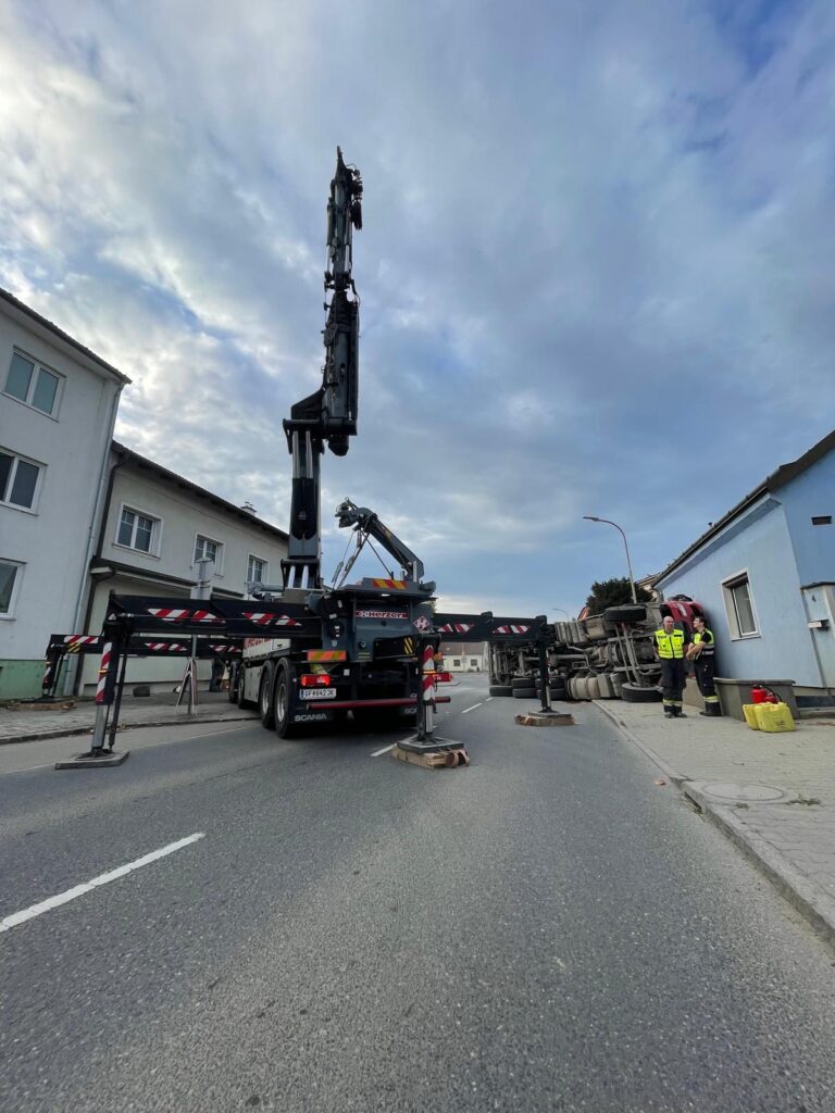 Beim Eintreffen der ersten Einsatzkräfte zeigte sich folgende Lage: Der LKW war auf die Seite gekippt und lehnte an der Hauswand. Der Fahrer hatte das Fahrzeug bereits verlassen und wurde vom Roten Kreuz erstversorgt. Aus dem beschädigten Tank trat jedoch eine größere Menge Diesel aus, wodurch eine erhebliche Umweltgefährdung bestand.
